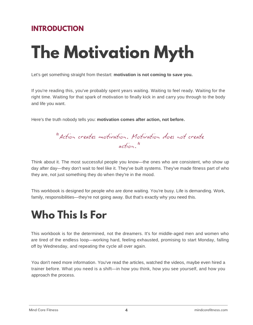 The Mind Core Mindset Workbook is a hands-on 6-month transformation journal designed for busy professionals who are done with the endless restart cycle. This isn’t another fitness book that collects dust on your shelf — it’s a daily practice that rewires how you think about showing up for yourself.